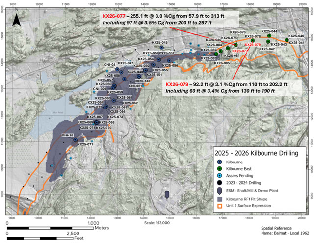 - Hole KX26-079 intersected 92.2 ft at 3.1% Cg from 110.0 ft to 202.2 ft, including 60.0 ft at 3.4% Cg from 130.0 ft to 190.0 ft, consistent in grade with the main Kilbourne resource.