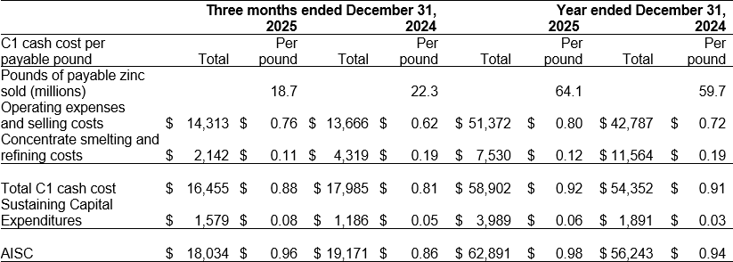 AISC measures the estimated cash costs to produce a pound of payable zinc plus the estimated capital sustaining costs to maintain the mine and mill. This measure includes the C1 cash cost and capital sustaining costs divided by pounds of payable zinc sold. AISC does not include depreciation, depletion, amortization, reclamation and exploration expenses.