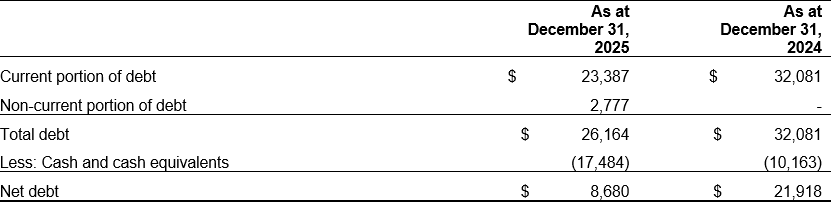 Net debt is calculated as the sum of the current and non-current portions of long-term debt, net of the cash and cash equivalent balance as at the balance sheet date. A reconciliation of net debt is provided below.