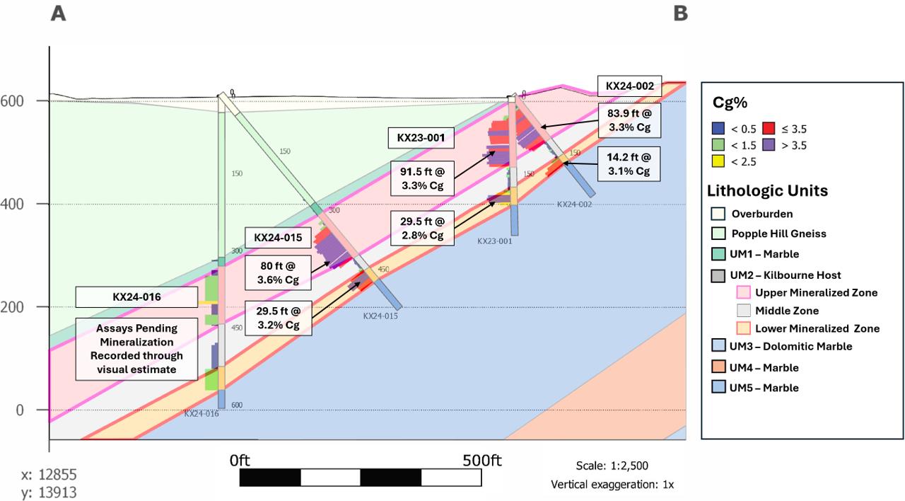 The assay results have continued to exceed expectations, with the grade of mineralized drill intercepts averaging 3.2% Cg (graphitic carbon). Individual samples within the mineralized zones have returned assays ranging up to 11.3 % Cg (KX24-007 from 165.0 ft to 168.2 ft, part of the noted 13 ft interval from 160.0 ft to 173.0 ft at 6.0% Cg).