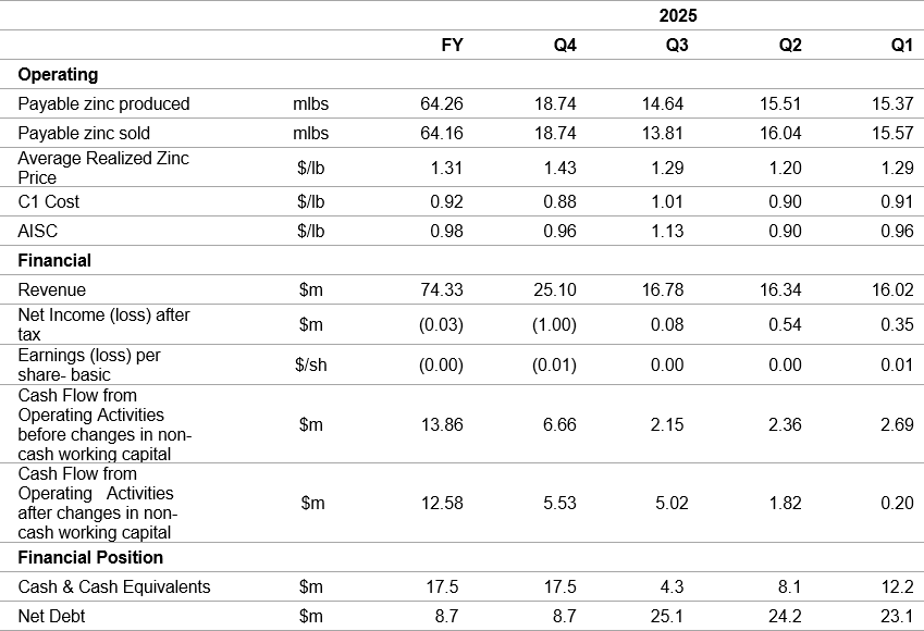 - Zinc production: 18.7 million payable pounds in Q4 2025 and 64.3 million payable pounds for the full year, up 8% from FY 2024, representing record production at Empire State Mines (“ESM”) and achieving 2025 production guidance